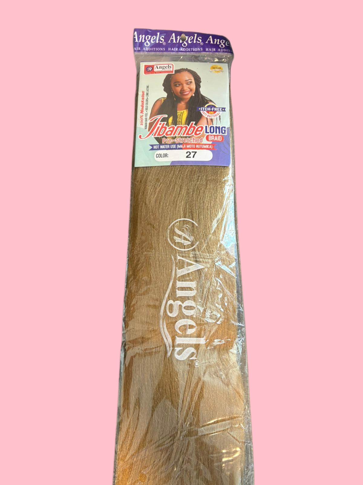 Angels Khambe Long is pre-stretched synthetic braiding hair designed for lightweight, long-lasting styles. Color 27 for a golden honey tone.